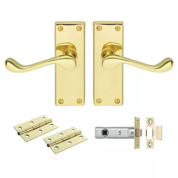 Pack includes a pair of handles, hinges and a tubular latch. Scroll shaped lever on latch backplate. A traditional Victorian styled handle. Suitable for domestic use.